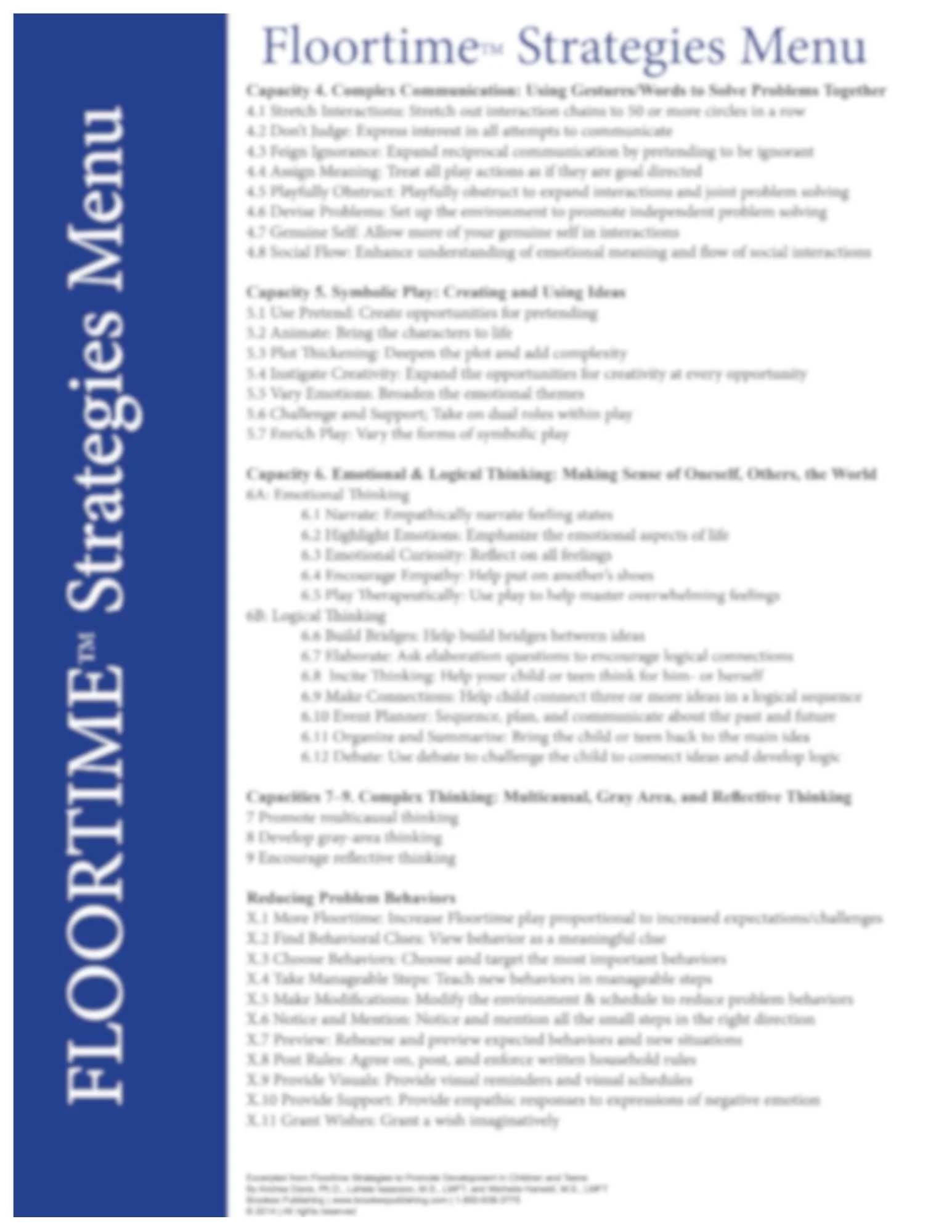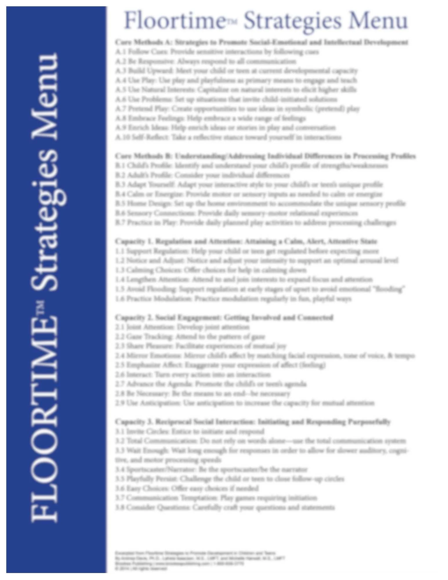 I have many books on Floortime. This one is hands down the best. It's also the best reference to give parents to use - it's written in a practical, brief and to-the-point format, without a ton of text on the page to overwhelm the reader. You can pick it up, read a page or two on that stage or that aspect of intervention and put it down and off you go, ready to deal with what comes. It's large format makes it user friendly and inviting. The authors came up with adult things to focus on for each level, for example Level one (Regulation and Engagement) has the parallel task for the caregiver of "attunement' - this is enourmously helpful to the caregiver or therapist because the inevitable question is always "what do I do?" when faced with addressing the child's constrictions in each level. It uses fairly plain language and boils it down to a simple pragmatic approach. If you what to actually do Floortime, rather than study it intensively, this book is the first book you should buy. If you are doing Floortime this is the absolute best thing to hand to parents because it's user friendly, readable, not super expensive and beautifully done. Kudos to the authors, they filled a real need with this one.